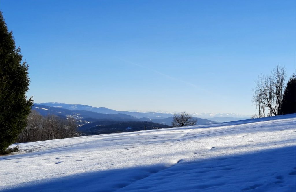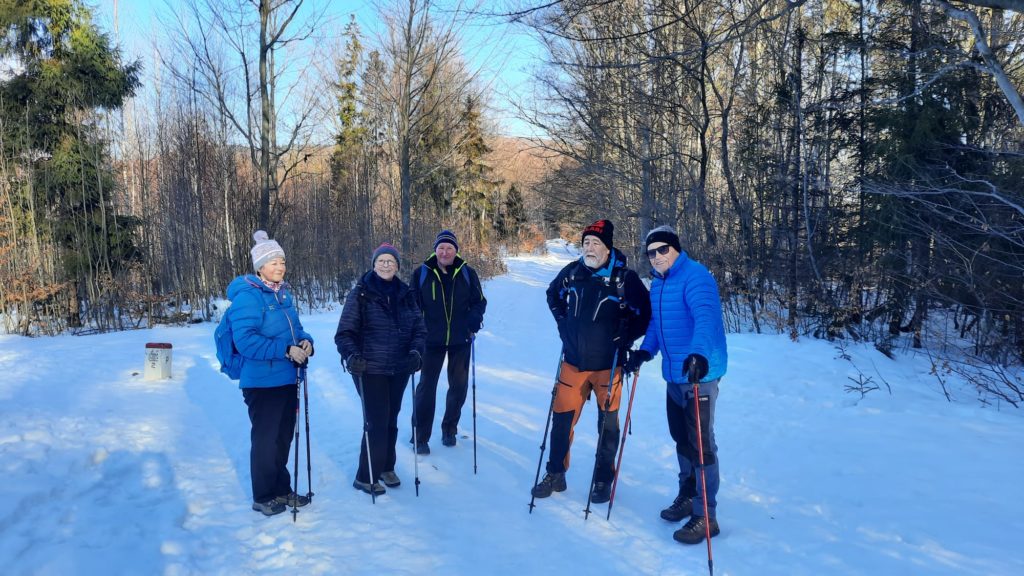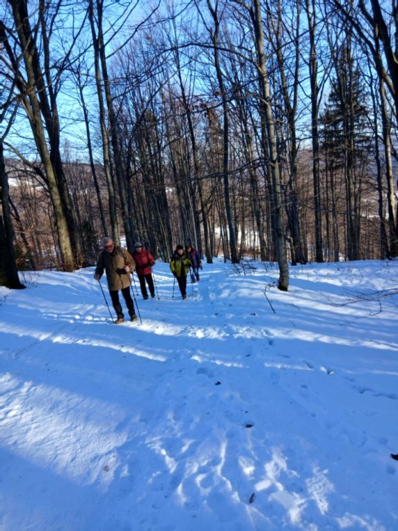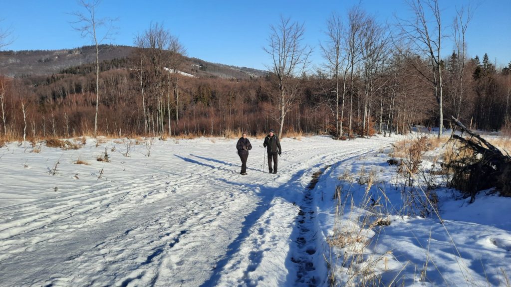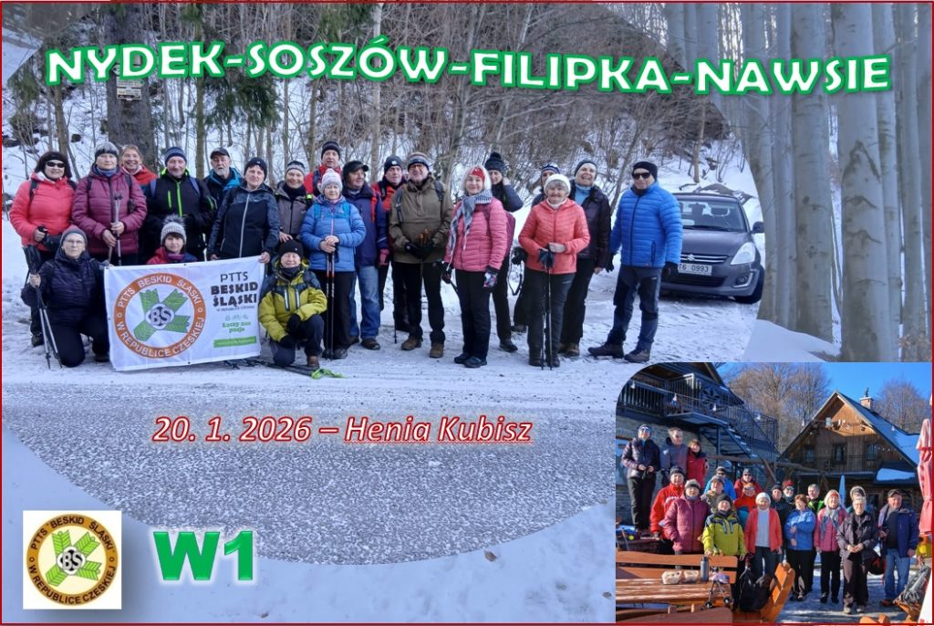 20.1. – Na wycieczkę z Nydku Strzelmy do Nawsia przez Wielki Soszów, Cieślara, Mały Stożek i Filipkę zaprosiła Beskidzioków Henryka Kubisz. To była jej, jako kierownika, premierowa wycieczka! Dzień był słoneczny, mroźny a szlaki oblidzone i śliskie. Bez raczków byłoby trudno!